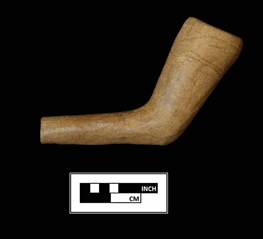 complete terra cotta pipe bowl with partial stem, unidentified geometric rouletted design, sloppy. |