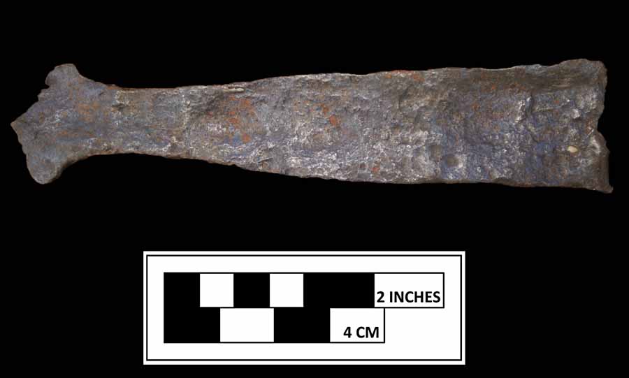 wrought iron strap hinge fragment, strap portion, appears to flare toward outer edge, opposite edge shows evidence of what may be a nail hole |