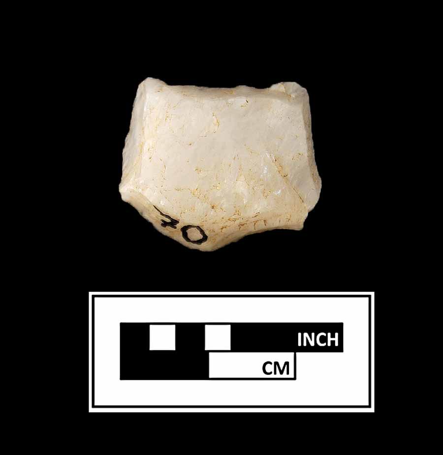 1 quartz gunflint fragment, bifacially worked. unidentified form, unidentified heel |