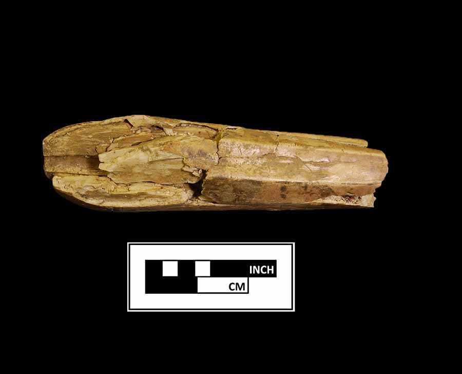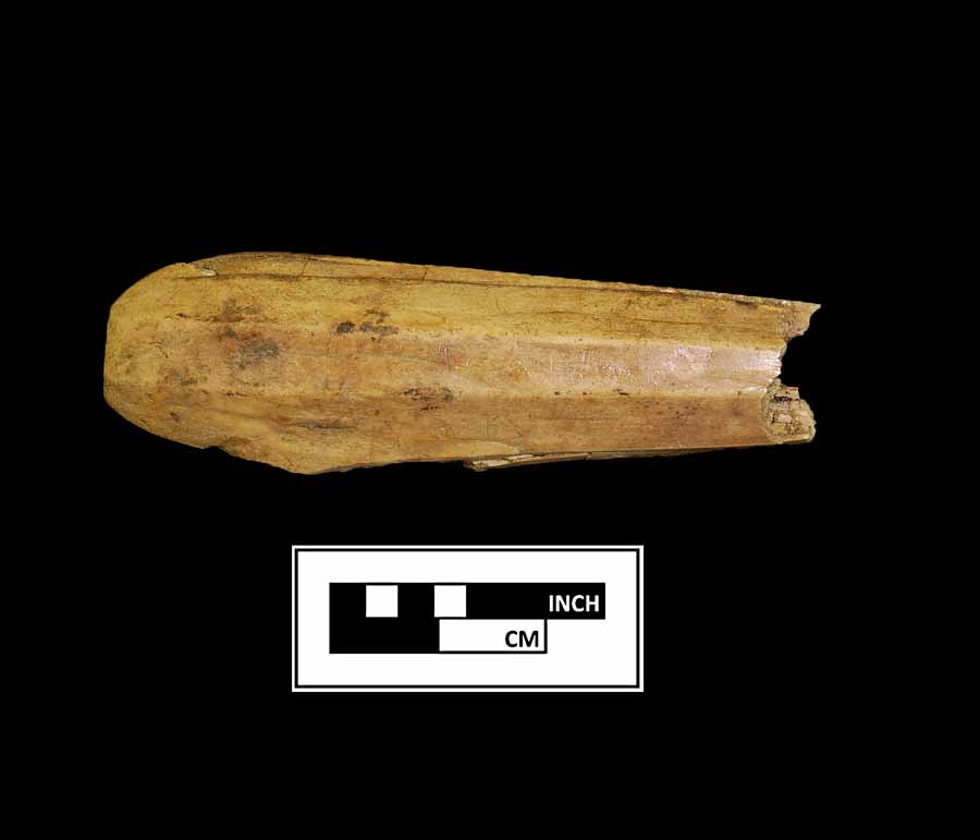 mended bone handle, octagonal profile, hole runs from rounded end to tang edge. Possibly etched initials "EP" (scratched in). Cataloged as "silver banded", but no band present. |