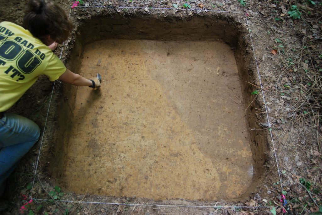 In 2009, 216 shovel tests were excavated at intervals of 100 feet in a wooded area where the