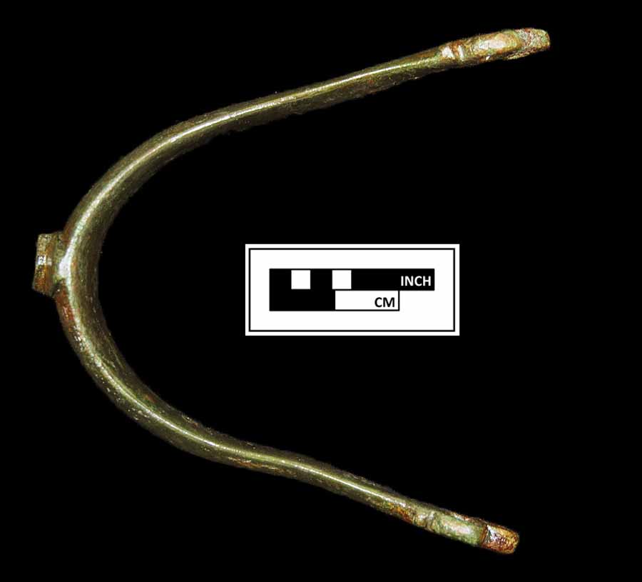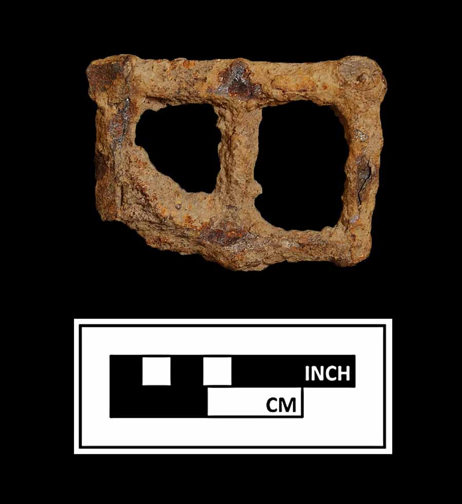 includes a stirrup, a spur, a fragmentary bit, three buckles, a leather ornament, and three