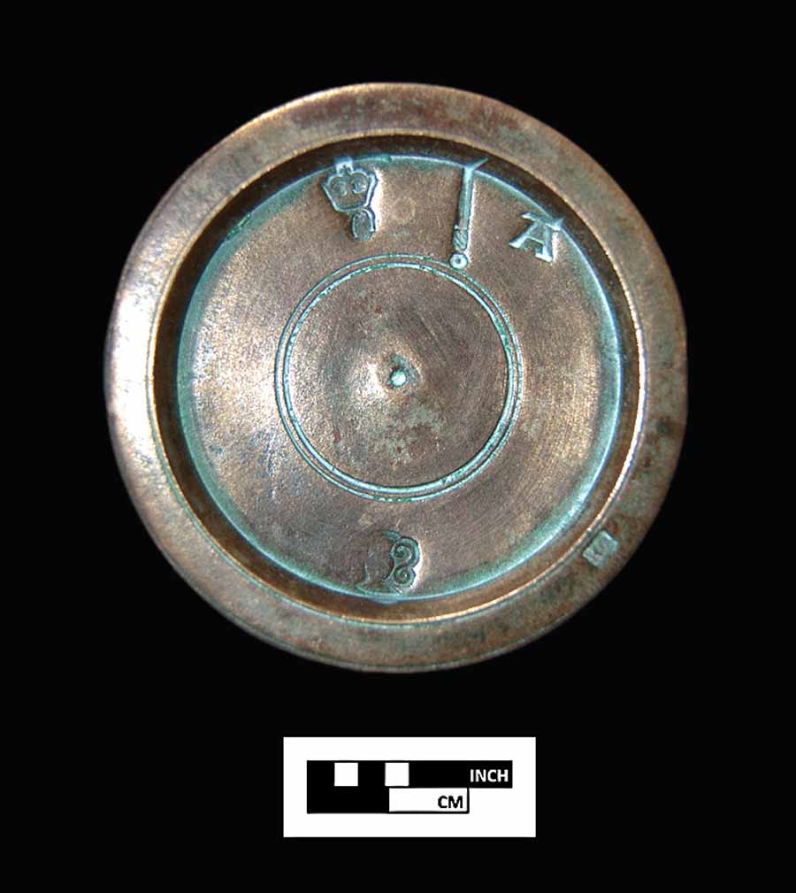 a lead bun weight and brass disk weight, along with a possible pan for weighing items. An unusual and